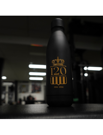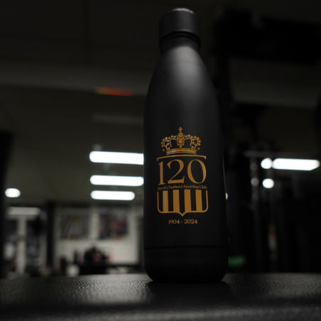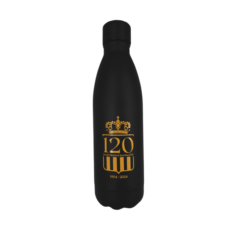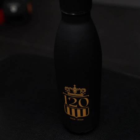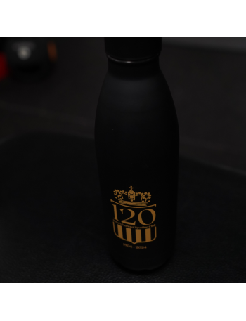 Gourde métallique noire de 790ml reprenant le logo 120ans doré